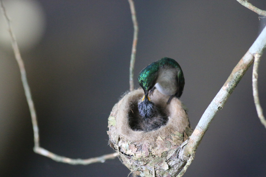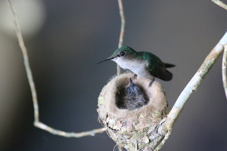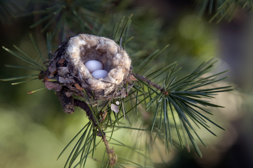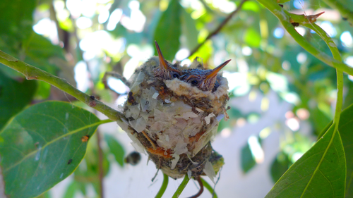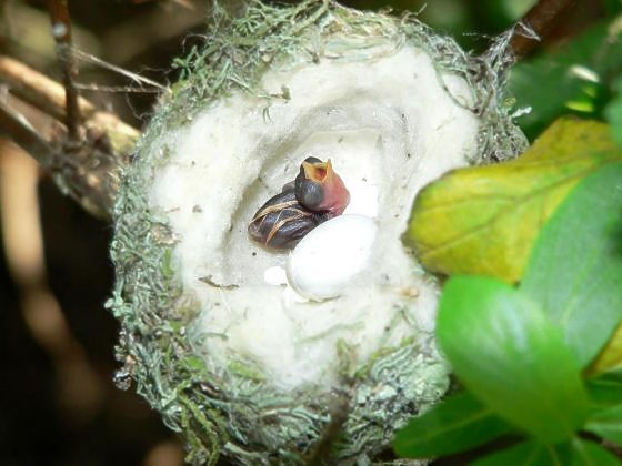 蜂鳥通常會在樹枝或樹枝間築巢,一次會產下兩個非常小的蛋,孵化期通常為15至19天,孵化後17天,背部便會長滿鮮豔羽毛, 並開始練習飛行,看看蜂鳥寶寶剛出生的模樣,是不是真的很可愛呢?!