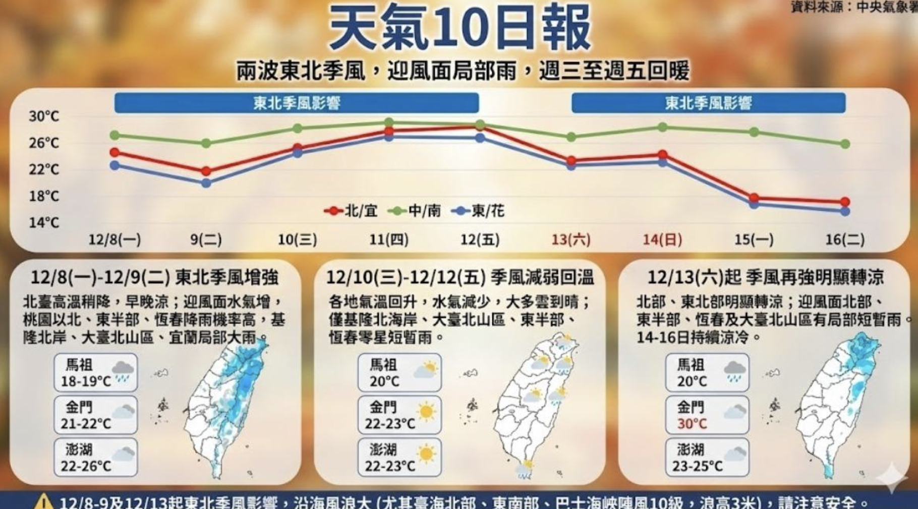 另外,氣象署特別提醒,海象部分8至9日風浪最明顯,沿海浪高約3公尺,外出務必多添衣物並留意安全。