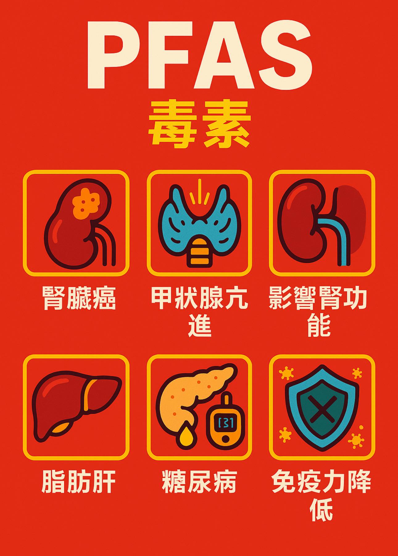 醫師進一步說明,鐵氟龍塗層就是由PFAS製造而成,過去普遍應用在不沾炊具、抗油與防污塗層等領域,堪稱PFAS最廣為人知的用途。這類物質一旦被人體吸收就極難代謝排除,可能在體內停留長達數年之久。PFAS透過飲食、飲水、空氣或皮膚接觸進入人體,隨血液循環後會囤積於肝臟、腎臟、甲狀腺等重要器官。