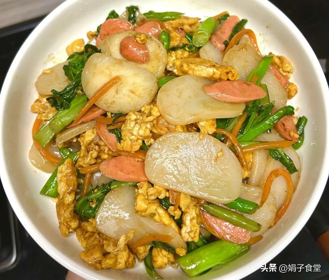 3、鍋中油熱後放入火腿腸片翻炒,然後放入胡蘿蔔絲、青菜炒至斷生,再放入雞蛋和年糕,加入適量生抽、老抽、蚝油、胡椒粉調味,翻炒均勻即可出鍋。