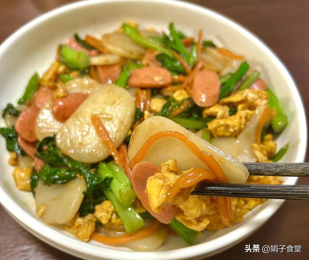 食材:年糕、雞蛋、青菜、胡蘿蔔、火腿腸、生抽、老抽、蚝油、胡椒粉