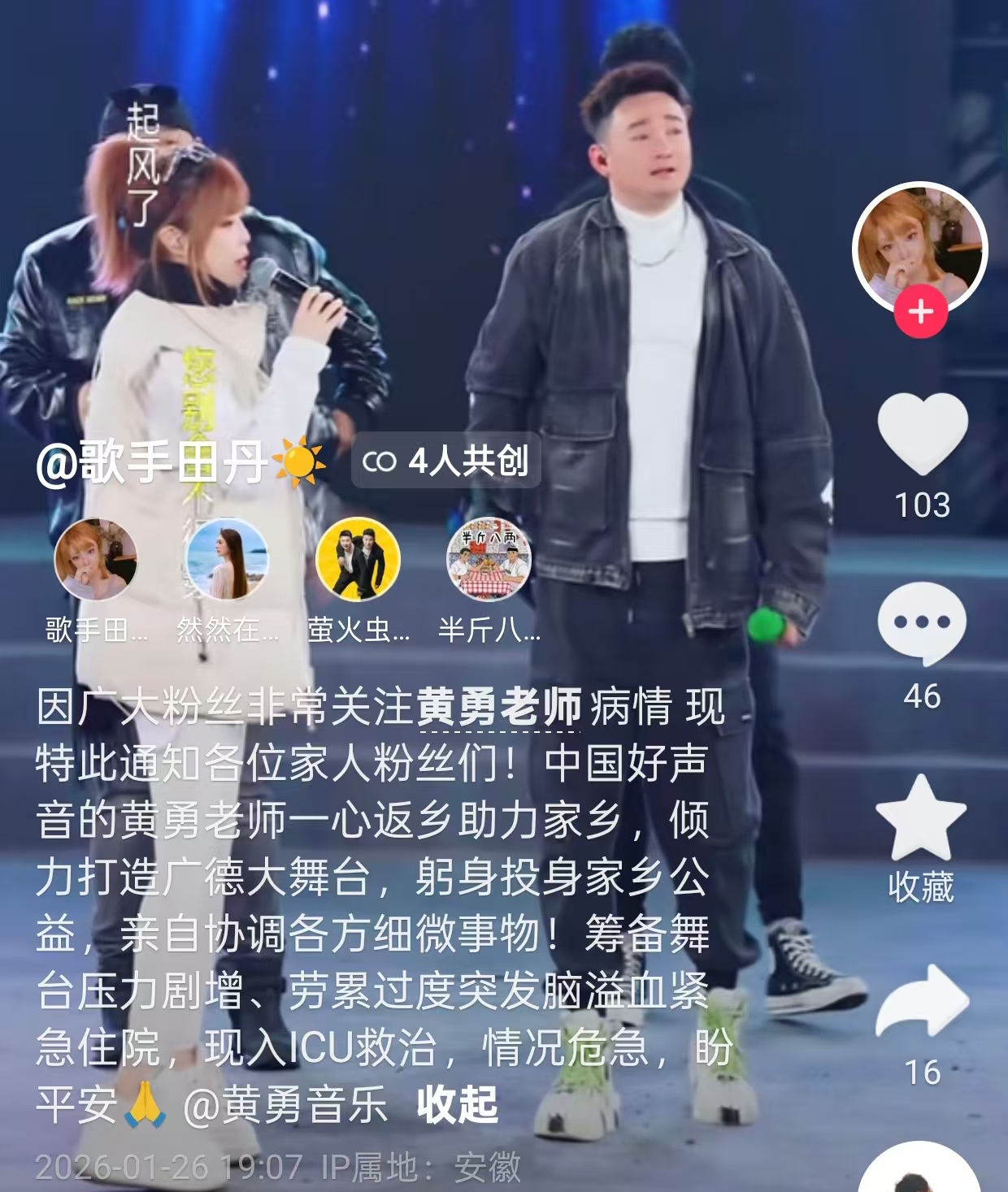 19:07,歌手田丹的發文令人揪心,她透露黃勇入院的病因是突發腦溢血,一句「現入ICU救治,情況危急,盼平安」似乎推翻了不久前黃勇徒弟所說的病情穩定住了。