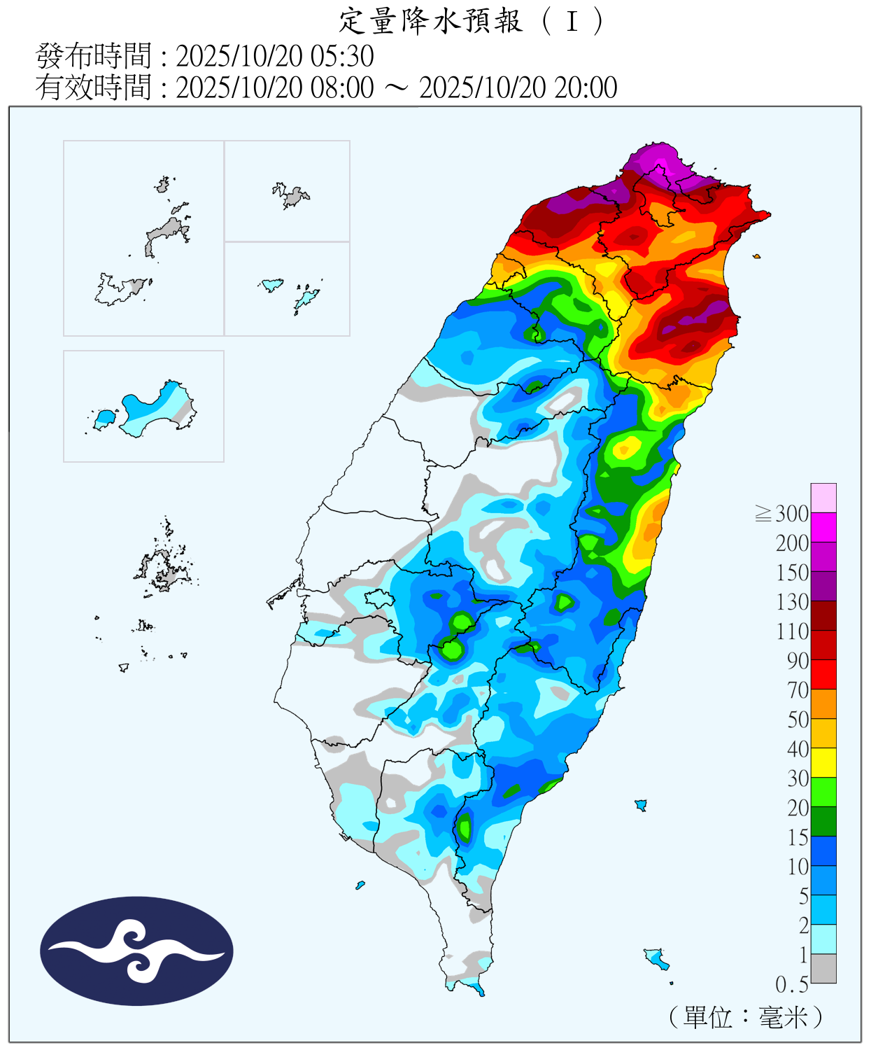 氣象專家指出,根據最新定量降水預報顯示,未來48小時內桃竹以北及宜蘭地區的累積雨量將超過每12小時150毫米(雨區預報圖呈現紫色),成為共伴降雨的重災區。中央氣象署可能因此發布大規模或劇烈豪雨特報,民眾須提高警覺。