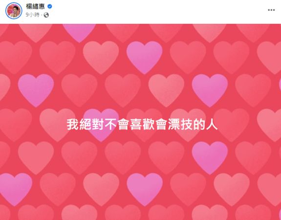 楊繡惠在約凌晨12點時在臉書發文,簡明扼要地寫下,「我絕對不會喜歡嫖妓的人」,讓許多人感到一頭霧水,只知道楊繡惠所指的應是一名男性。而她又在該文的留言處繼續發炮,「有一個人想弄我,你沒想到我可以弄死你」,言詞間情緒十分激動,透露與對方勢不兩立的關係。
