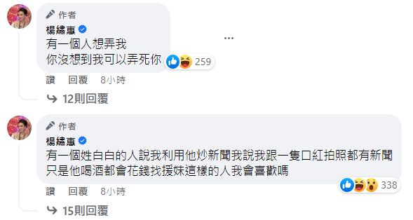 對於對方的身份,楊繡惠也給出了提示,「有一個姓白白的人說我利用他炒新聞,我說我跟一隻口紅拍照都有新聞,只是他喝酒都會花錢找援妹,這樣的人我會喜歡嗎」,若比對姓白之男性,幾乎可以排除與楊繡惠曾交惡的白冰冰,且文中也提到「炒新聞」3字,指出對方也是「公眾人物」、「藝人」,立刻吸引破千人按讚、留言,猜測對方的真實身份。