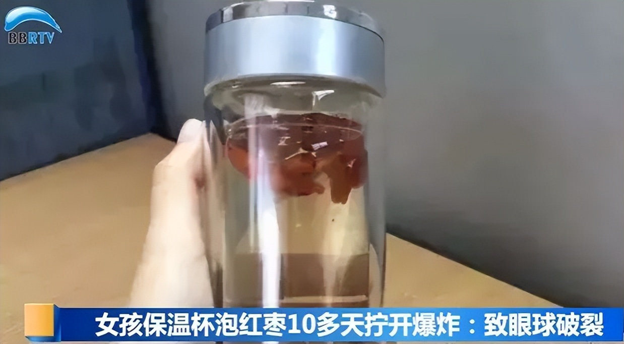 福建一名女孩,準備將泡了十多天紅棗的保溫杯擰開,結果在擰開瞬間保溫杯發生了爆炸,導致女孩眼球破裂、虹膜脫落。