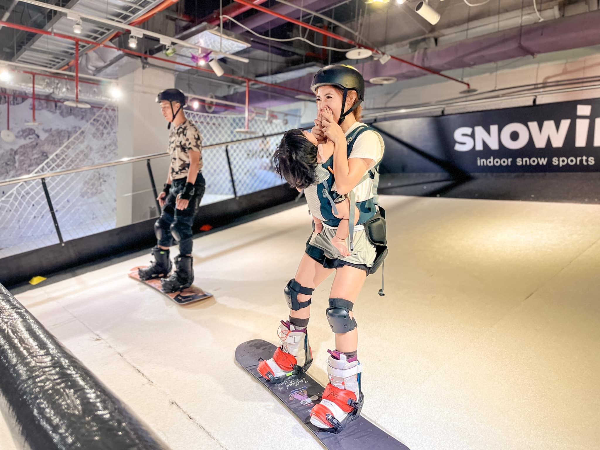 在「林叨囝仔」當時的貼文中,母女加上腹中胎兒3人,一同到台南某間滑雪學校運動。從貼文的照片中可以看到,「林叨囝仔」全身護具齊全,頭盔、護膝應有盡有,還有教練在身側指導,可說是非常安全。但是,眼尖的網友發現,胸前僅1歲的六女兒身上卻沒有任何護具,頸部也沒有支撐物件,看起來非常危險。