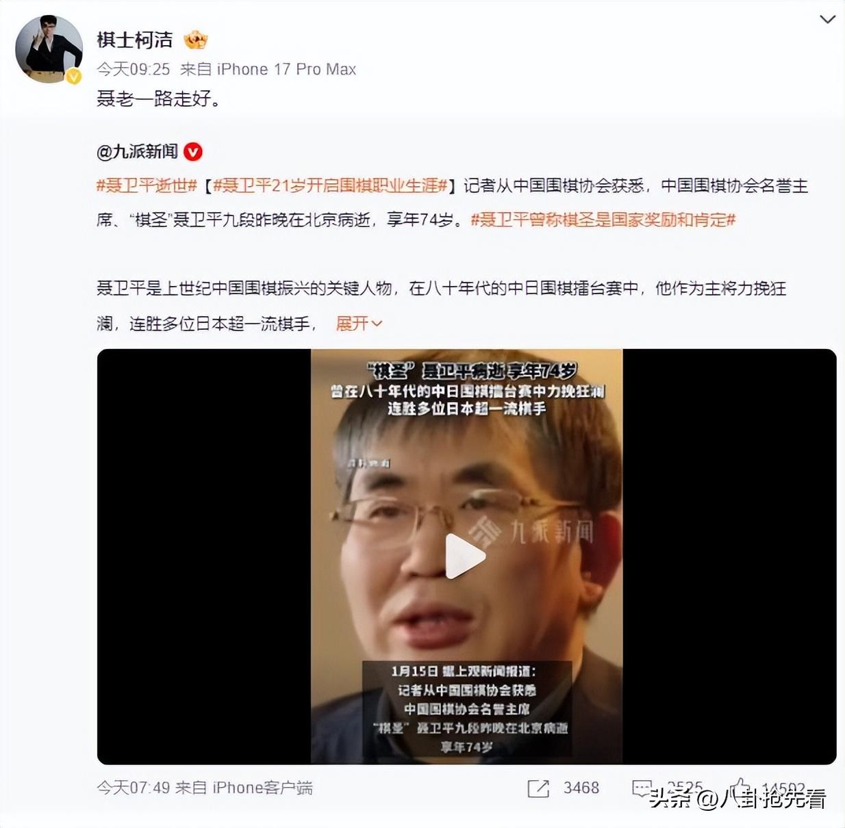 1月15日的時候,聶雲菲出來發文表示,圍棋界的泰斗,聶衛平因為醫治無效而離世。