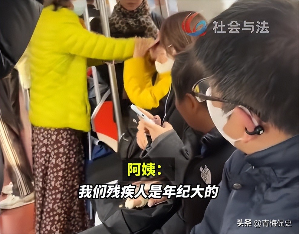 剛開始還一切正常,可沒過一會就傳來了爭吵聲,湊近看才發現是這位黃衣大媽拿著殘疾證正逼迫一位小姑娘讓座。
