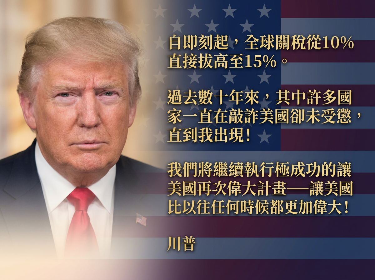 根據《ettoday新聞雲》報導,美國最高法院日前針對川普的對等關稅政策作出否決裁定,美國總統川普(Donald Trump)周六透過社群平台Truth Social投下震撼彈,宣布將剛公布不到24小時的「臨時全球關稅」稅率,從10%直接拔高至15%。