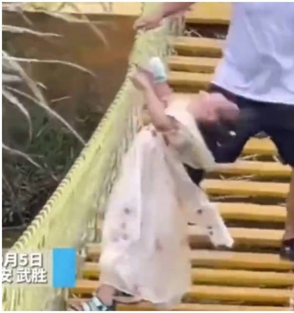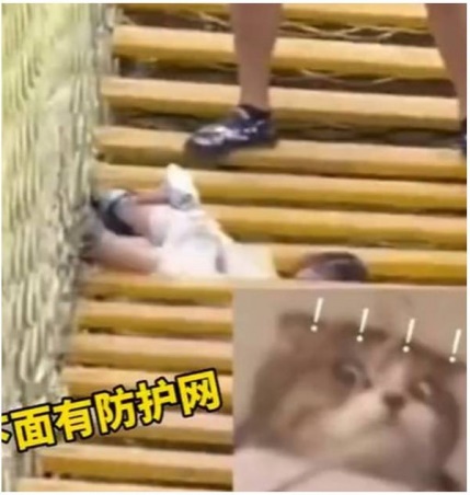 據《ETtoday新聞雲》報導,這起事件發生在大陸四川省廣安市,小女孩當天被父母帶去風景區遊玩,並走上了一座位於水池上的吊橋。從影片中可見,後方的爸爸不停笑著搖晃吊橋,女兒則拼命抓著吊橋其中一側,還因此嚇哭,最後她仍因劇烈搖晃從橋的隙縫中掉了下去,所幸下面有防護網保護,才沒有發生悲劇。